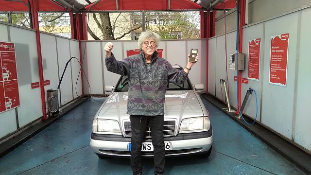 Und was passiert? Der Mann bietet nicht nur Wechselgeld an, mit dem man die Automaten befüllen kann, sondern er bietet auch an, zu zeigen, wie der weitere Ablauf in der Praxis geht - und dann führt er letztendlich eine gesamte Autowäsche durch.