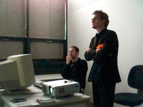 "Es ist hier nicht der Ort..." all das auszukommentieren, was hier einigen ausgesuchten Besuchern schon in einer Art "Generalprobe" von den beiden Master-Studenten vorgestellt wurde. Ihnen erging es nicht anders als den Urherbern selber: sie waren fast erschlagen von der Vielzahl der Bilder, Töne und Texte, die dort in einem der Studienräume an die weisse Wand prozeziert - bzw. aus zwei riesigen Lautsprechern wiedergegeben - wurden.