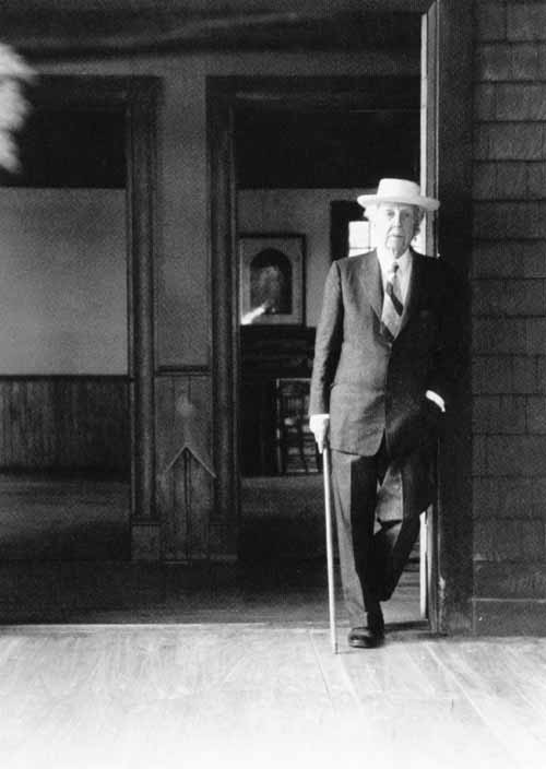 Frank Lloyd Wright am Eingang zur Kapelle auf seinem Besitz Taliesin in Wisconsin.