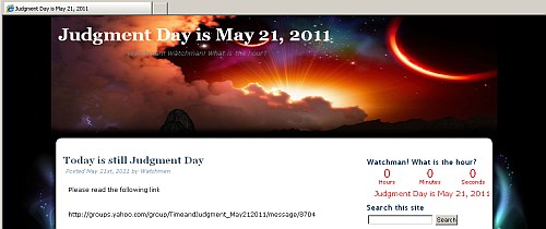 Laut Auskunft von Ministrywatch hat es die Family Stations, Inc. mit ihrem Family Radio Programm geschafft, den Leuten einzureden, dass heute der erste Tag eines Zeitfensters begänne, an dessem Ende nicht nur die Erde ihr Ende nehmen würde, sondern, mit dem Erscheinen eines grossen "fireballs" am 21. Oktober 2011, das ganze Universum. [1]