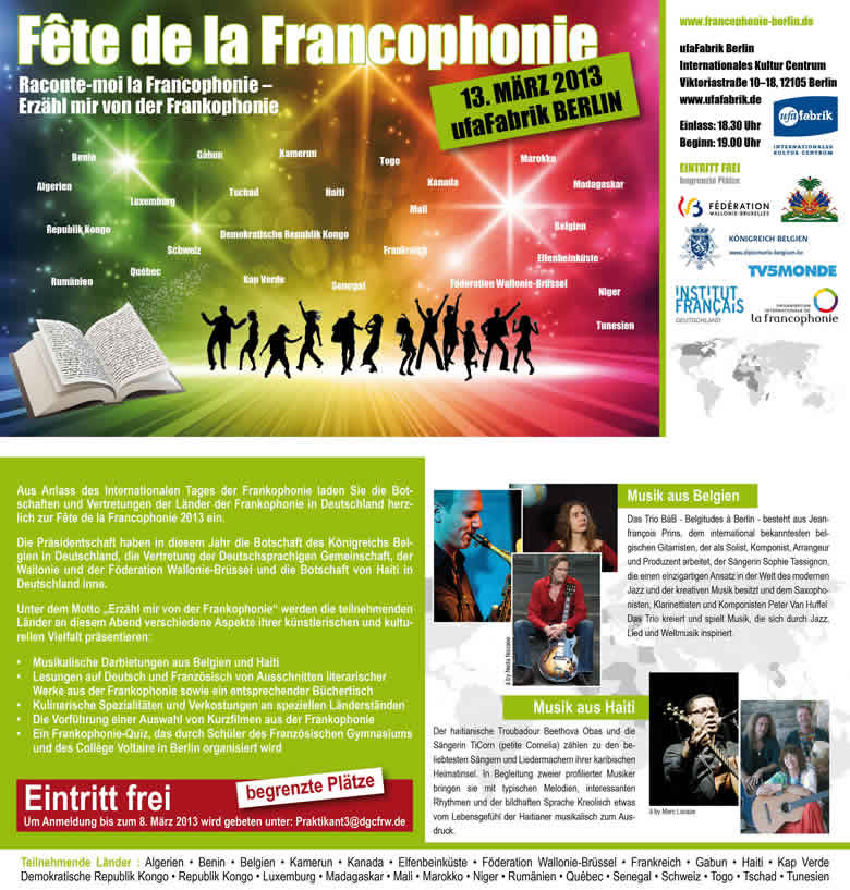 Am Mittwoch, dem 13. März 2013 ab 19 Uhr findet die traditionnelle „Fête de la Francophonie“ in den neu gestalteten Räumen des Internationalen Kultur Centrums ufaFabrik, Viktoriastr. 10-18, 12105 Berlin statt. Dieses kulturelle Ereignis wird durch die Botschaften und Vertretungen der Länder der Frankophonie in Deutschland organisiert, die in diesem Jahr unter der Präsidentschaft der Botschaft des Königreichs Belgien in Deutschland, der Vertretung der Deutschsprachigen Gemeinschaft, der Wallonie und der Föderation Wallonie-Brüssel und der Botschaft von Haiti in Deutschland stehen.