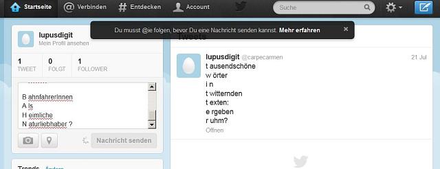 Es stellt sich, zurück in Berlin, heraus, dass dies in diesem Fall kein Übertragungsproblem aus dem Zug war, sondern dass dieser "Deutsche-Bahn-Text" nicht abgesetzt werden konnte, weil das System verlangte, zunächst eine(n) "@ie" als Follower zu einzutragen.