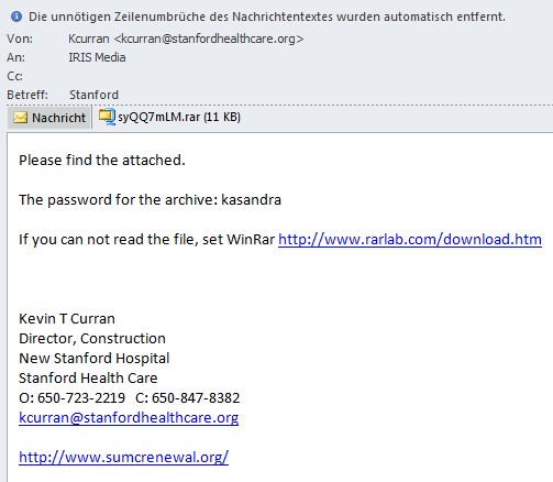 Auch der Name der absendenden Institution: "New Stanford Hospital, Stanford Health Care" passt aus diesem aktuellen Anlass genau ins Bild.