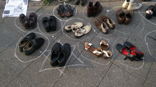 Und: Diese Schuhe, die die TeilnehmerInnen an dieser Versammlung zum Gedenken hinterliessen:
