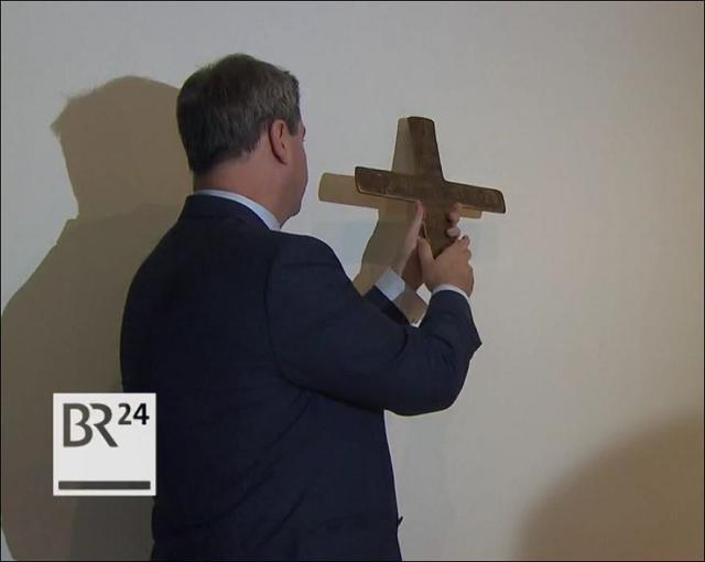 Darin geht es um Stellungnahmen [2] und Kommentare zu der öffentlich demonstrierten Entscheidung des neuen Bayerischen Ministerpräsidenten, dass in jeder öffentlichen Einrichtung wieder deutlich sichtbar ein Kreuz ausgehängt werden solle. Darin heisst es: