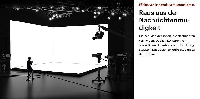 Da das nicht für einen ganze Sendestunde reicht, geht es auch noch um das Thema der Nachrichtenmüdigkeit (Apathie, Verdruss, Desinteresse) und um konstruktiven Journalismus, über dessen Ansatz inzwischen "mehr als 12 Studien" vorliegen würden... danach kommen solche Beiträge eher bei jenen Leuten gut an, die noch über keine grosse Vorbildung zu dem dargestellten Thema verfügen.