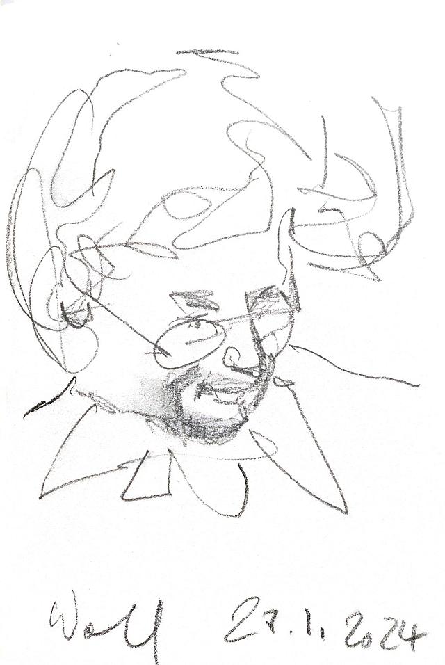Diese Seite mit Bildern - und heute auch Tönen - zum Sonntag schliesst an den vorangegangenen Beitrag vom "KI: Das Ende des Menschen?" Ab 15 Uhr live im Radio, online oder vor Ort an, der wiederum an den Bericht und das Bild über den Beginn der Klausur am 7. Dezember 2023 Bezug nimmt. Hier werden jene Zitate und Rückmeldungen aufgezeichnet, die während und nach der Veranstaltung eingegangen sind. Und in der folgenden Reihe angeordnet. Portraits durch den Zeichenstift, durch die Kamera, in der Aussage Dritter.