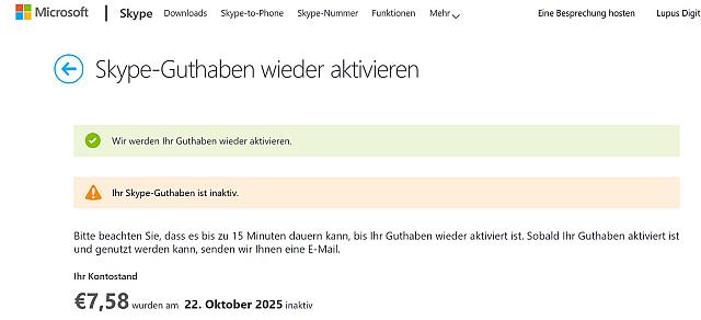 Ihr Guthaben bleibt 180 Tage lang nach Ihrem letzten Anruf an ein Festnetztelefon oder Handy bzw. nach Ihrer letzten von Skype aus gesendeten SMS erhalten